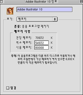 권장메모리 말그대로 저만큼 주면 잘돌아간다.. 최소메모리 최소 구동을 위해 플러그인을 불러들이거나 그밖의 것들 불러올때 필요한게 조정도, 사용메모리 지금 설치해놓은 프로그램이 사용하시는분이 할당한 메모리.. 입니다. 사용메모리나 최소메모리를 늘려주면 원할하게 잘 돌아가지만 만약 하드웨어상에 총 램용량이 128인데 쿼크 50메가, 포샵50메가, 이렇게 주고 일러 50메가 줘버리면 세가지 한꺼번에 열었을때 열리긴 하는데 작업하다가 튕길 위험이 쪼매 있죠..