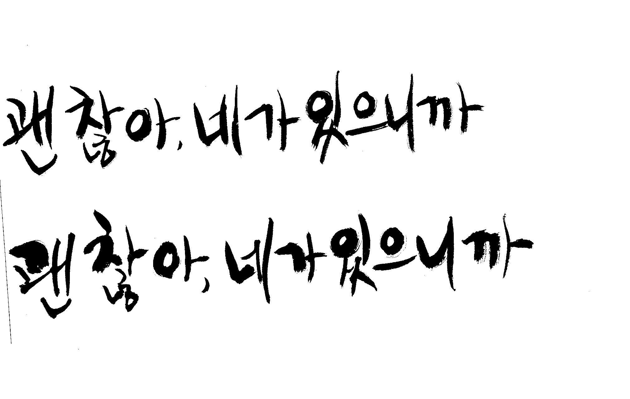 캘리 하나 부탁드릴께요. 김철호 일반 0 7257 2009.01.06 22:48 > > > > > 지금 작업중인 표지가있는데 > > > > 손글씨로 한번 작업해보려구요 > > > > 부탁드립니다. > > > > 괜 찮아, 네가 있으니까 > > >